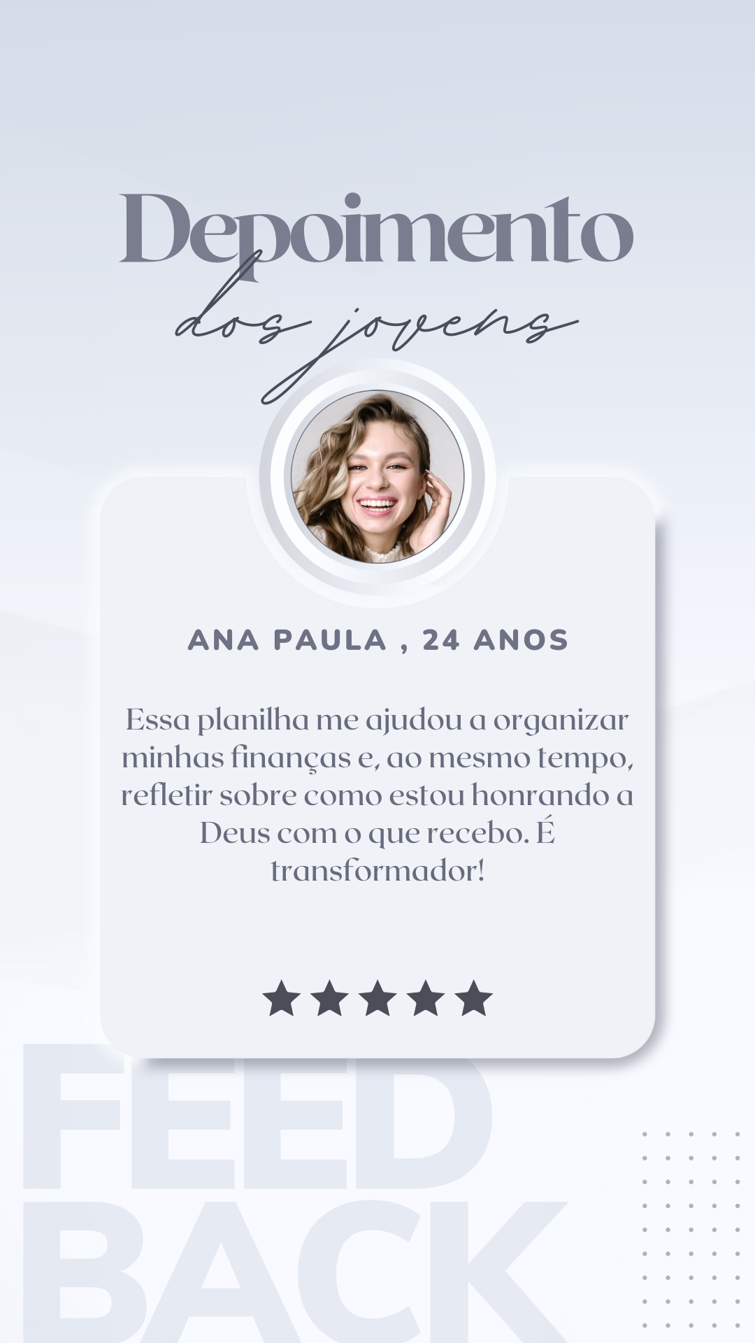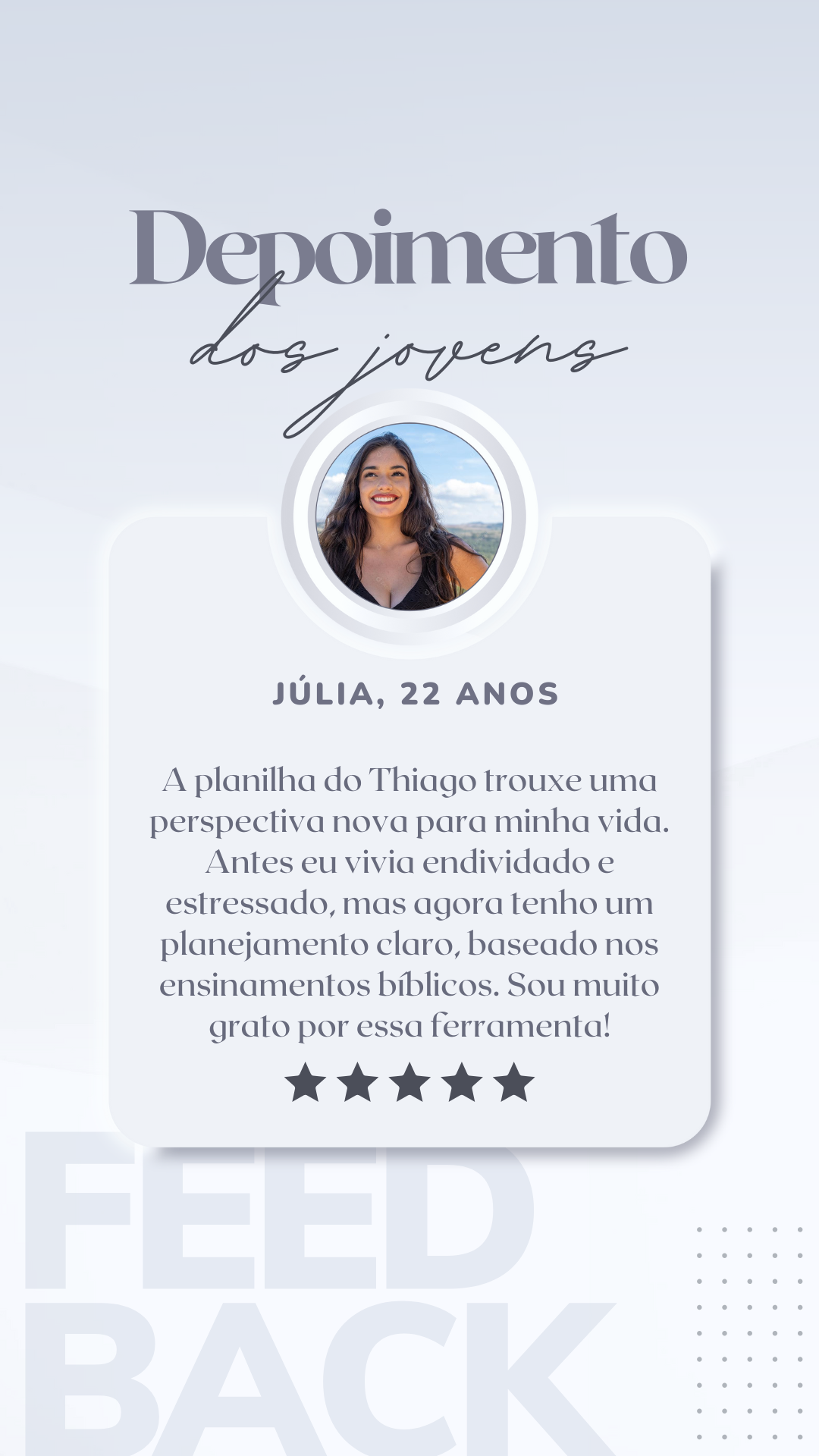 Essa é sua chance de alinhar suas finanças com os princípios de Deus. E para os primeiros que garantirem a planilha hoje, há um desconto especial de lançamento! Não perca essa oportunidade única de transformar sua vida financeira.